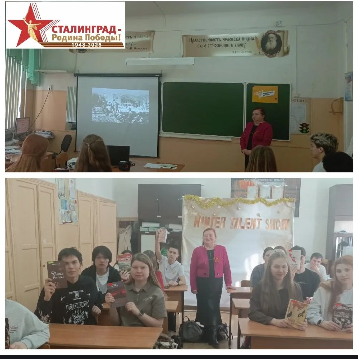 В преддверии этого дня сотрудники Центральной городской библиотеки в 11А (классный руководитель - Колемаскина Н.А.) и 11 Б классах (классный руководитель – Балибардина Н.Н.) провели Урок Мужества «200 дней и ночей Сталинграда», посвященный одному из самых решающих моментов Великой Отечественной войны.