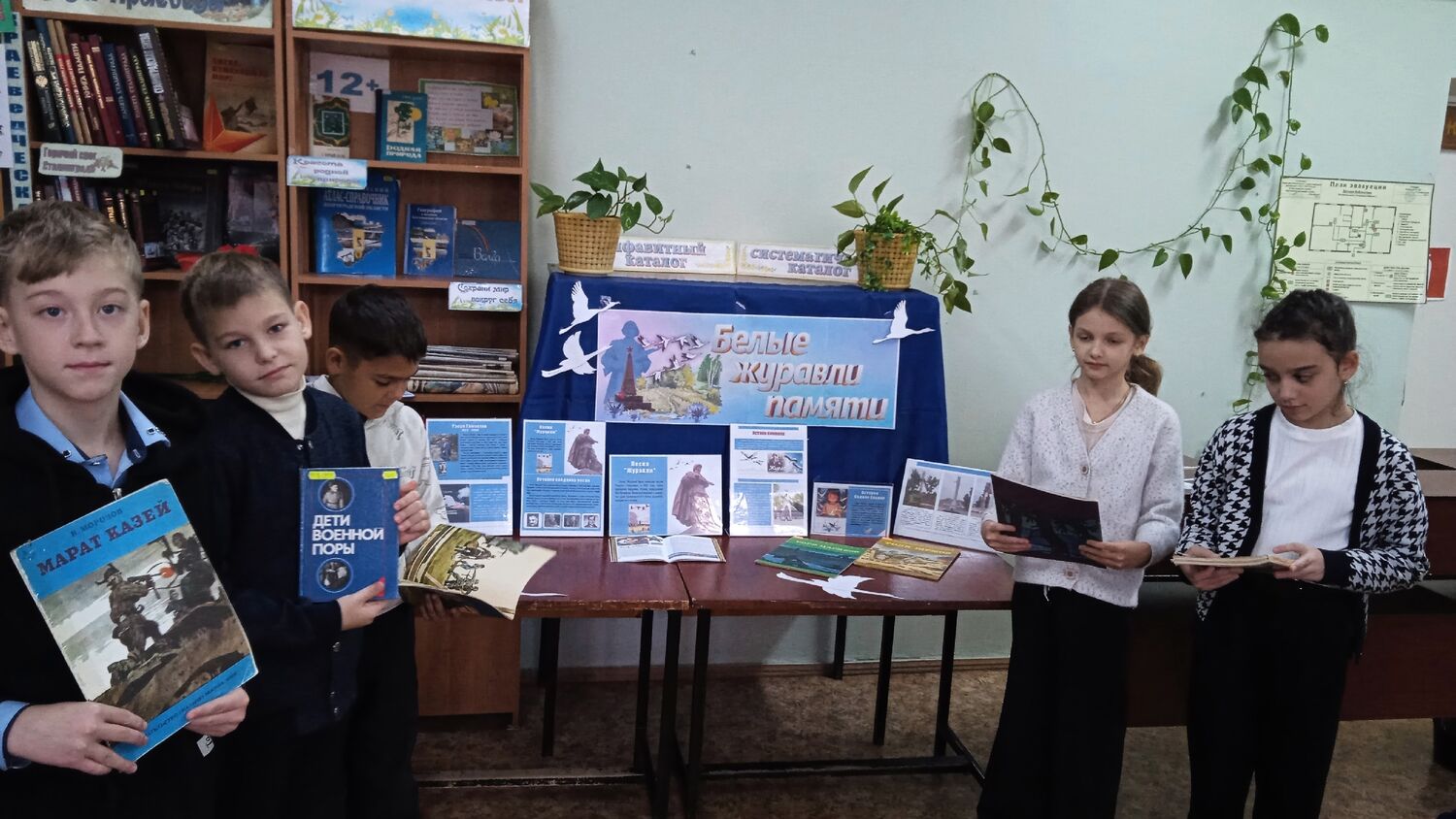 Ребята с интересом смотрели видео о памятниках с белыми журавлями, которые олицетворяют погибших на полях сражений воинов, которые защищали нашу Родину от врагов. Дети познакомились с тематической выставкой, читали стихи.