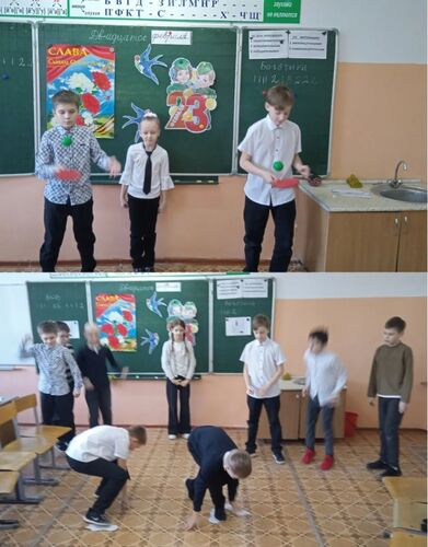 Каждая девочка нашего класса приготовила интересный конкурс для мальчишек. Будущие защитники отвечали на вопросы викторины, рисовали солдата, перебирались через воображаемое болото, пробовали себя в роли снайпера и медбрата - показали свою сообразительность, ловкость и силу.