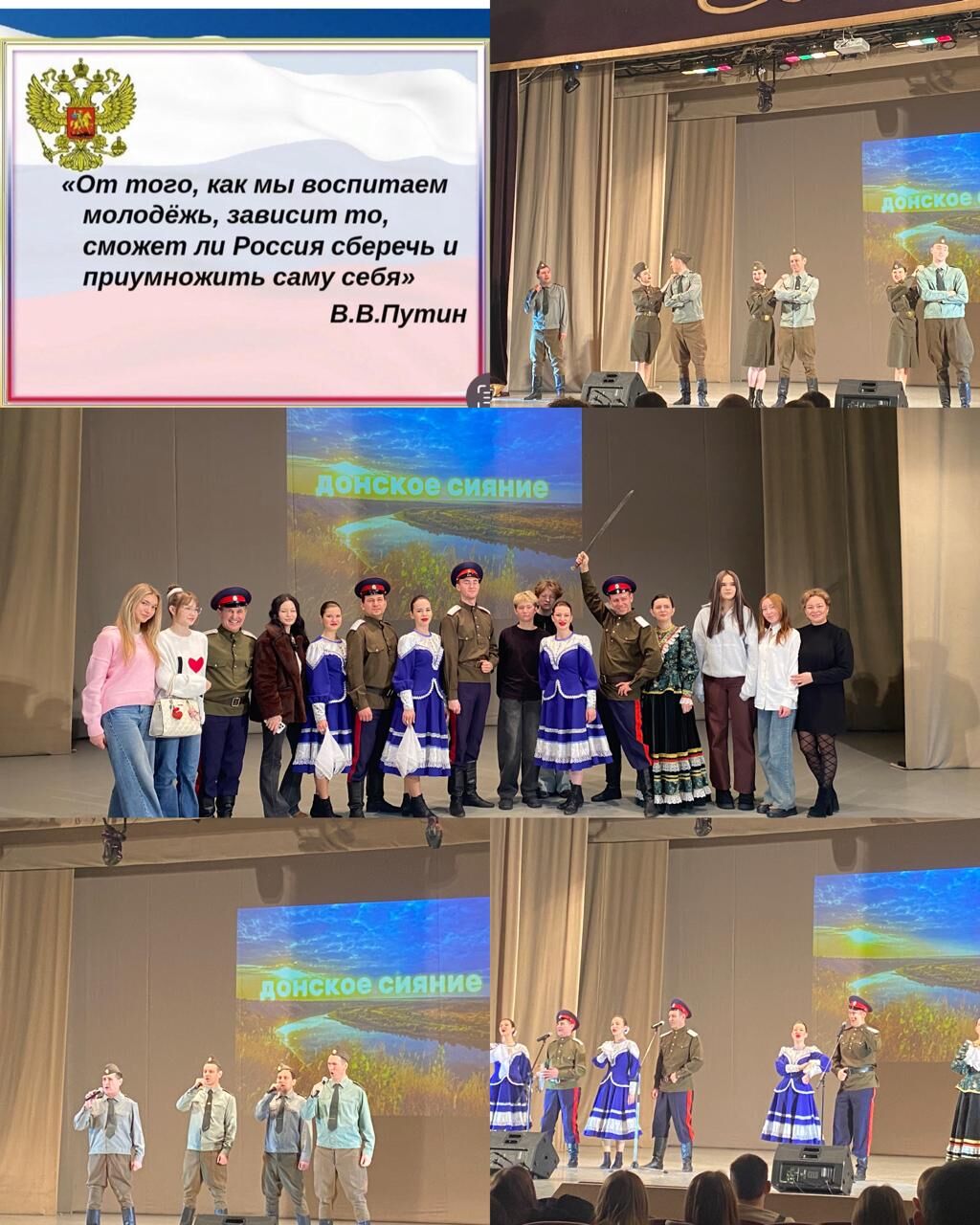 29 января 10 «А» класс вместе с классным руководителем Денисовой НМ побывал в Городском Дворце культуры на концерте ансамбля «Донское сияние» — программа «Слава защитникам Отечества». Ребята были погружены в атмосферу патриотических песен, вокально‑хореографических номеров, военных плясок, строевых маршей и лирических баллад; особенно запомнились сольные выступления Елены Ежовой и Андрея Щебуняева. После концерта многие ученики отметили силу эмоций, торжественность финальной композиции и глубокое уважение к подвигу предков. Мероприятие прошло по Пушкинской карте и стало важным уроком истории и патриотизма.