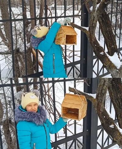 Семья Коноваловой Варвары, ученицы 3 Г класса, сделали кормушку, которую мы повесили на территории школы. И теперь ребята нашего класса ежедневно подкармливают птиц. А синички и воробьи с удовольствием лакомятся семечками, зерном, хлебными крошками.