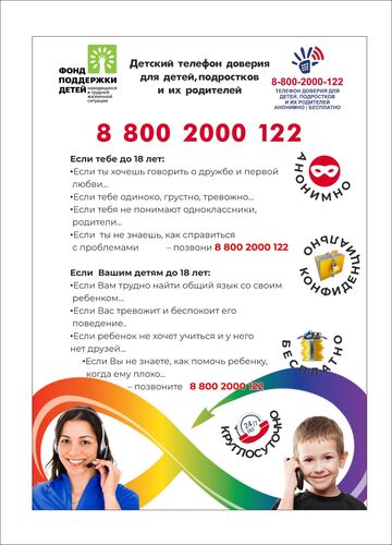 В любой момент нашей жизни может потребоваться психологическая помощь. Дети и их родители могут позвонить на бесплатный круглосуточный телефон доверия 8-800-2000-122 или 124. По этому телефону можно получить консультацию, совет как поступить в той или иной ситуации при возникающем конфликте в семье, между сверстниками, проблеме родителей и детей. На звонки отвечают опытные психологи, прошедшие специализированное обучение.