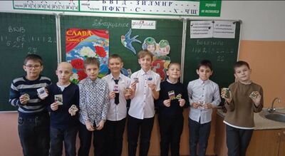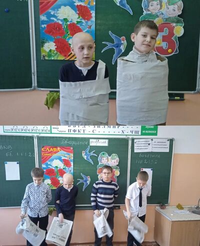Каждая девочка нашего класса приготовила интересный конкурс для мальчишек. Будущие защитники отвечали на вопросы викторины, рисовали солдата, перебирались через воображаемое болото, пробовали себя в роли снайпера и медбрата - показали свою сообразительность, ловкость и силу.