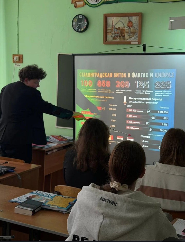 На днях в 10 Б классе прошел Урок Победы, посвященный одной из самых значимых страниц в истории Великой Отечественной войны — Сталинградской битве. Ведущим мероприятия выступил Быкадоров Иван, который провел информативную беседу о событиях, произошедших в Сталинграде в 1942-1943 годах.Иван поделился с одноклассниками историческими фактами, рассказывая о стратегическом значении Сталинграда, о мужестве и стойкости советских солдат, которые сражались за каждую улицу и каждый дом. Он акцентировал внимание на том, как эта битва стала поворотным моментом в ходе войны и укрепила дух всего советского народа.После беседы учащиеся 10 Б разделились на группы и приступили к работе с текстами о героях Сталинградской битвы. Каждая группа получила материалы, в которых были описаны подвиги известных защитников города. Работая в командах, ребята обсуждали прочитанное, делились впечатлениями и высказывали свои мнения о героизме и самоотверженности тех, кто сражался на фронте.Обсуждение оказалось очень живым и эмоциональным. Учащиеся не только узнали много нового о героях Сталинграда, но и осознали важность сохранения памяти о них. Каждый ученик отметил, что подвиги наших предков вдохновляют их на достижения в учебе и жизни.Классный час завершился общей рефлексией,
